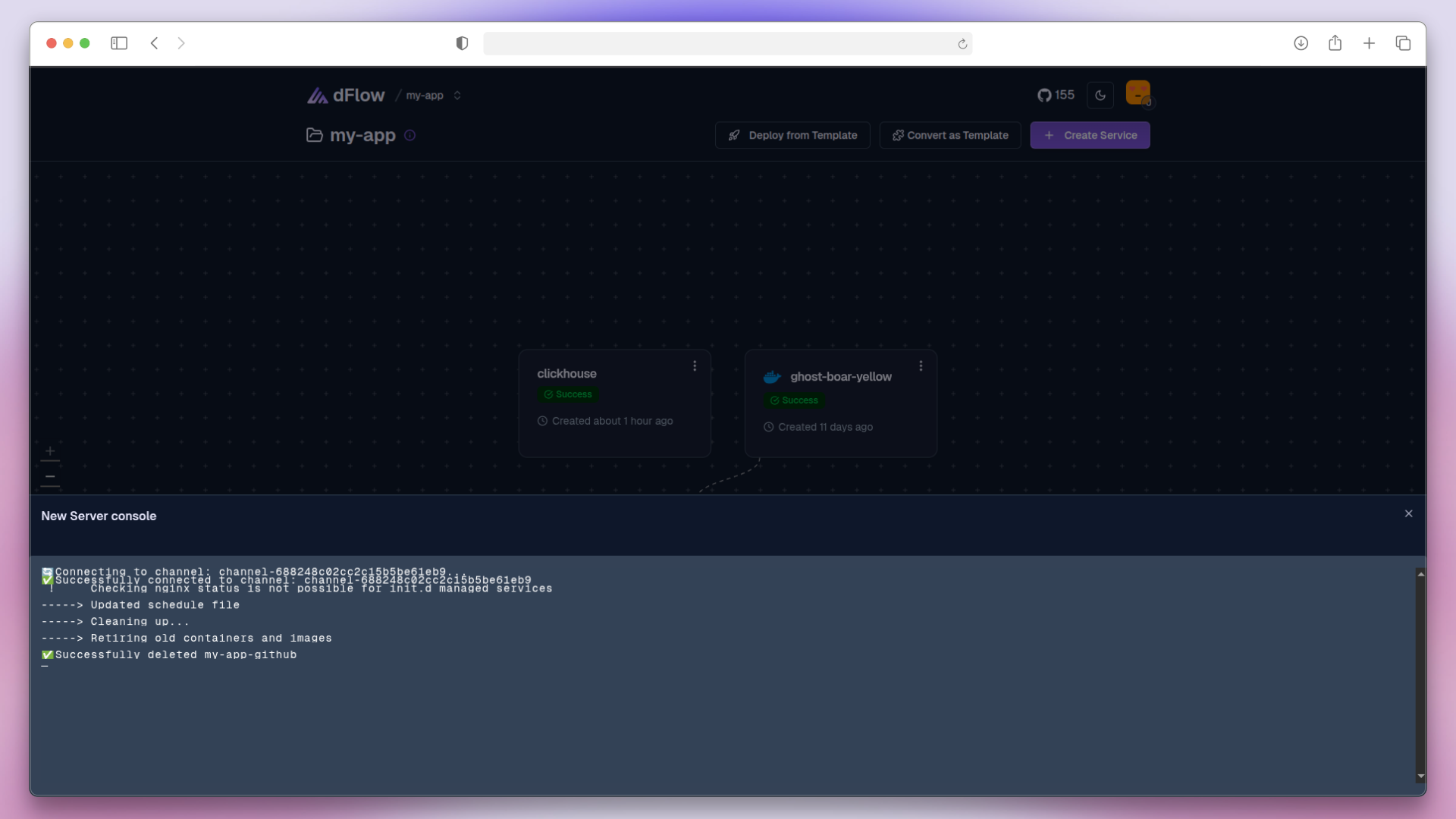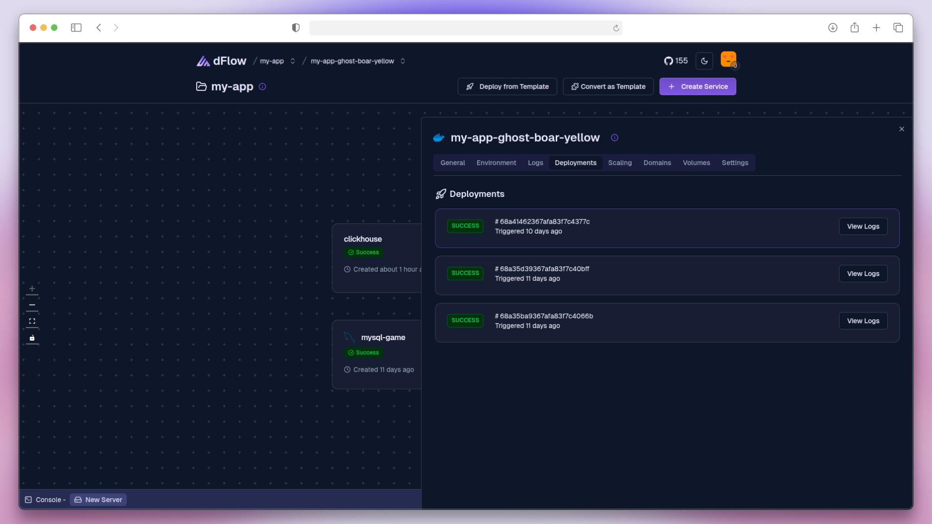 Logs for a specific deployment can be viewed by clicking on the deployments in the service window, useful when debugging application failures.
