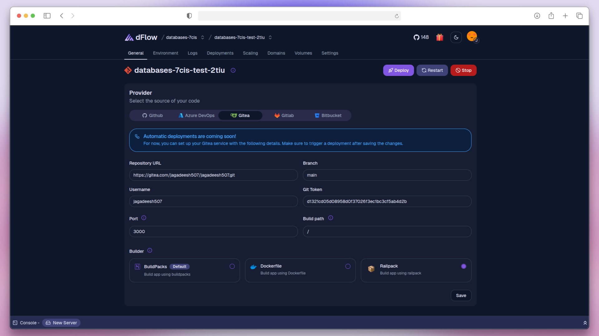 Connect your Gitea repositories to dFlow using Personal Access Tokens (PAT).